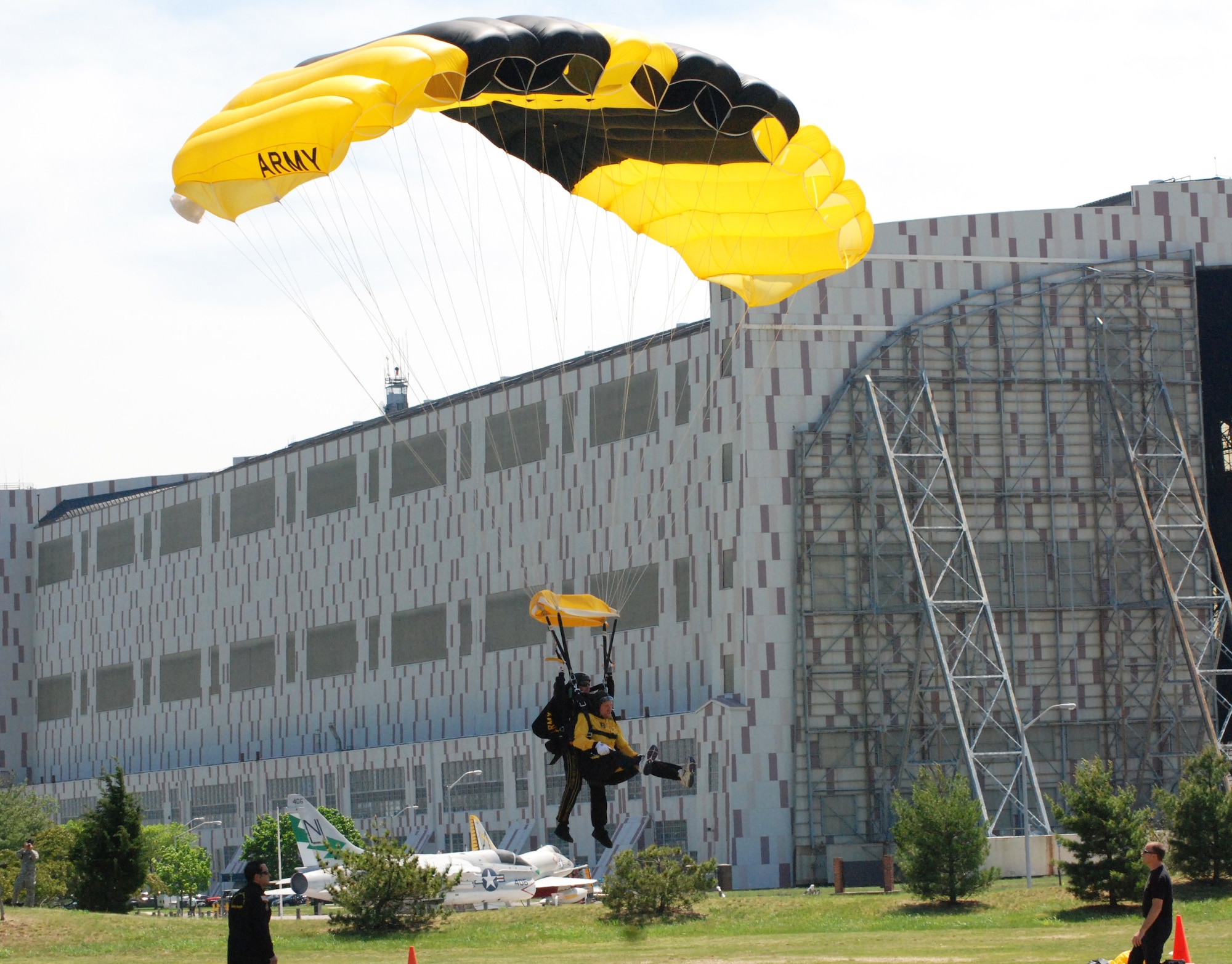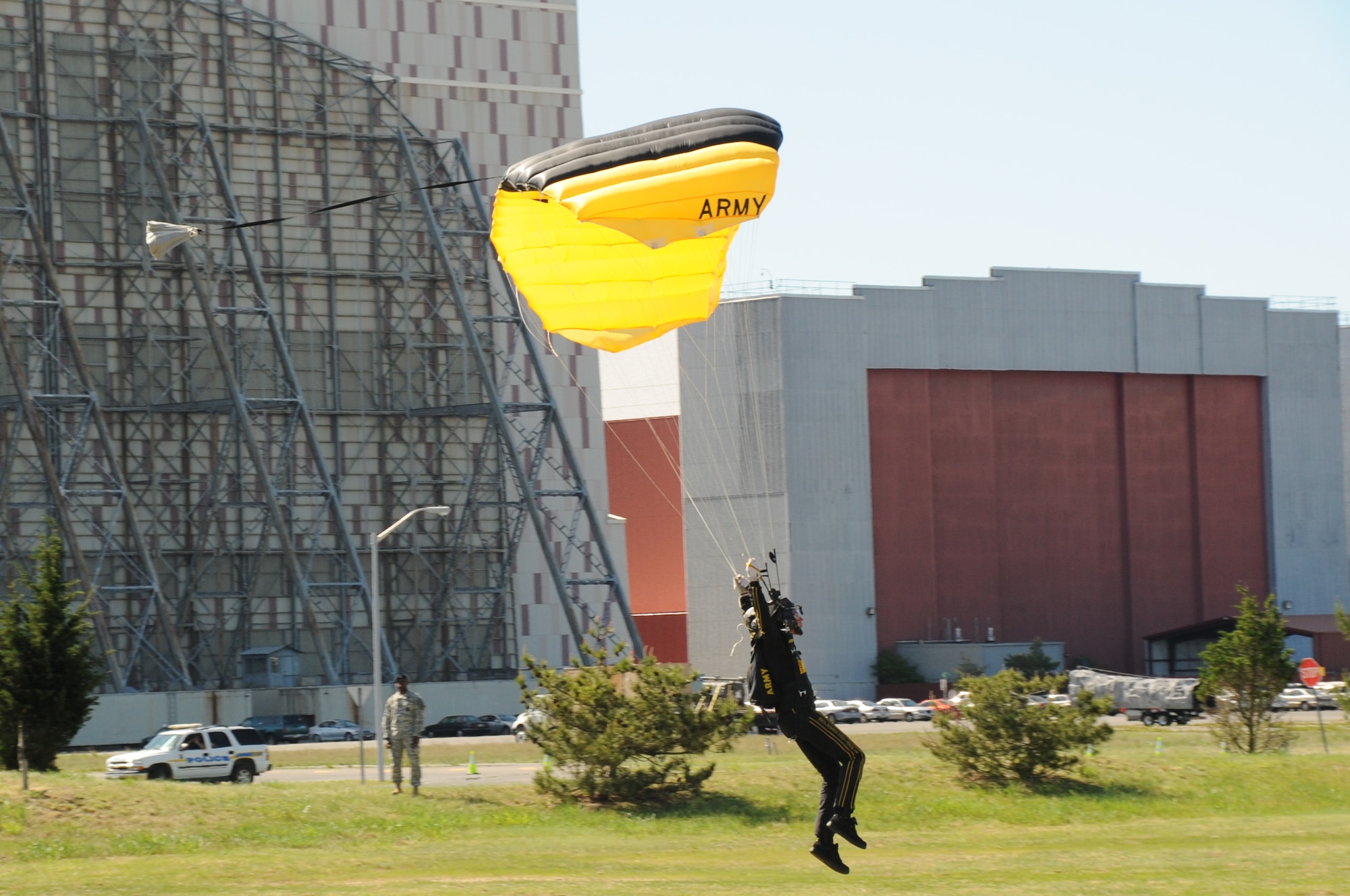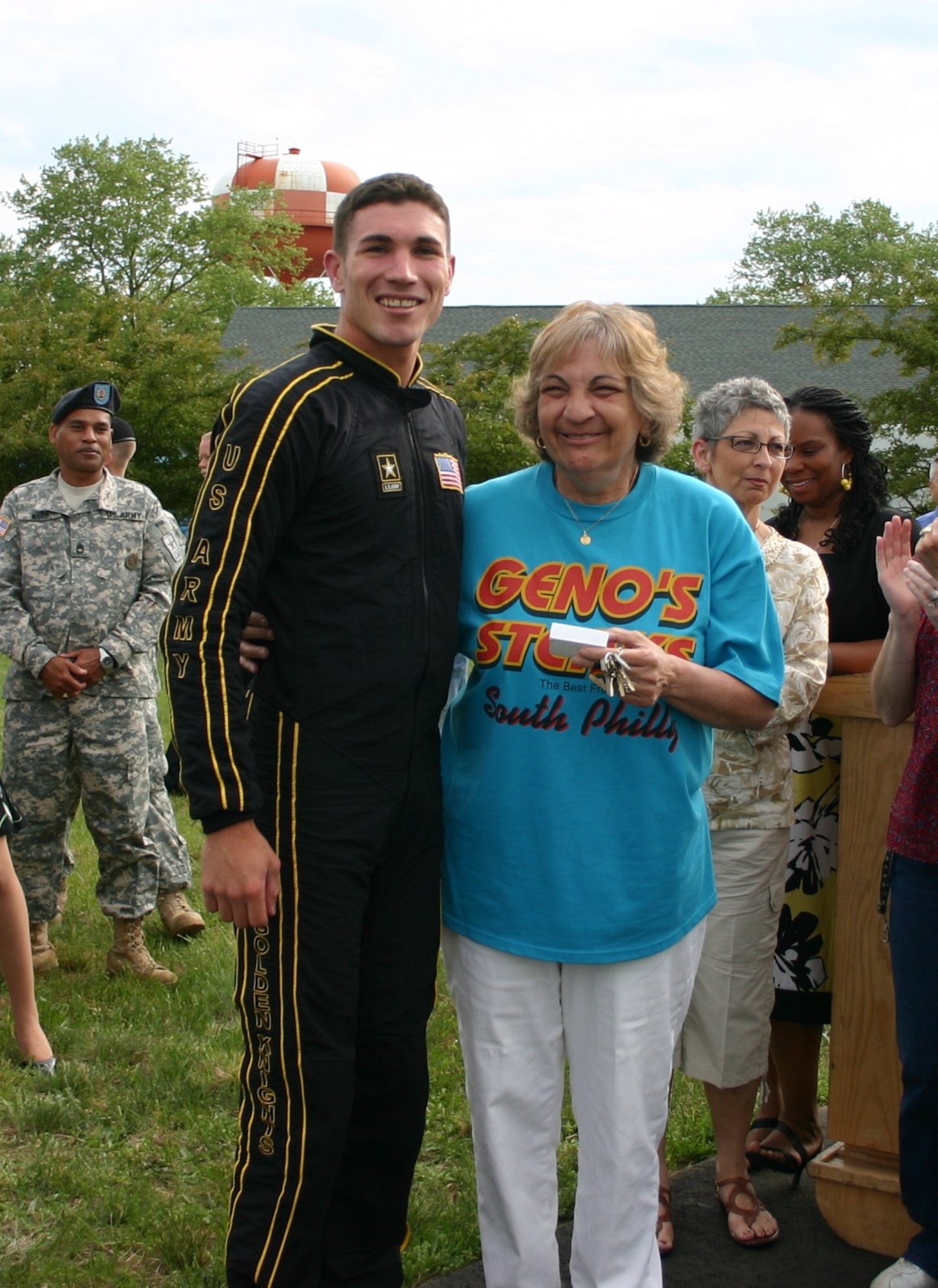 Mary Lou Kissling, Mid-Atlantic Recruiting Battalion, receives a pin commemorating her 40 years of service to the Navy. The pin was flown in by Army Staff Sgt. Jared Zell, a Golden Knight, during a tandem jump May 6 at Lakehurst. Ms. Kissling’s career began at the Philadelphia Naval Shipyard. She has worked for the Mid-Atlantic Recruiting Battalion for 15 years. (U.S. Navy photo/Sherry Jacob)