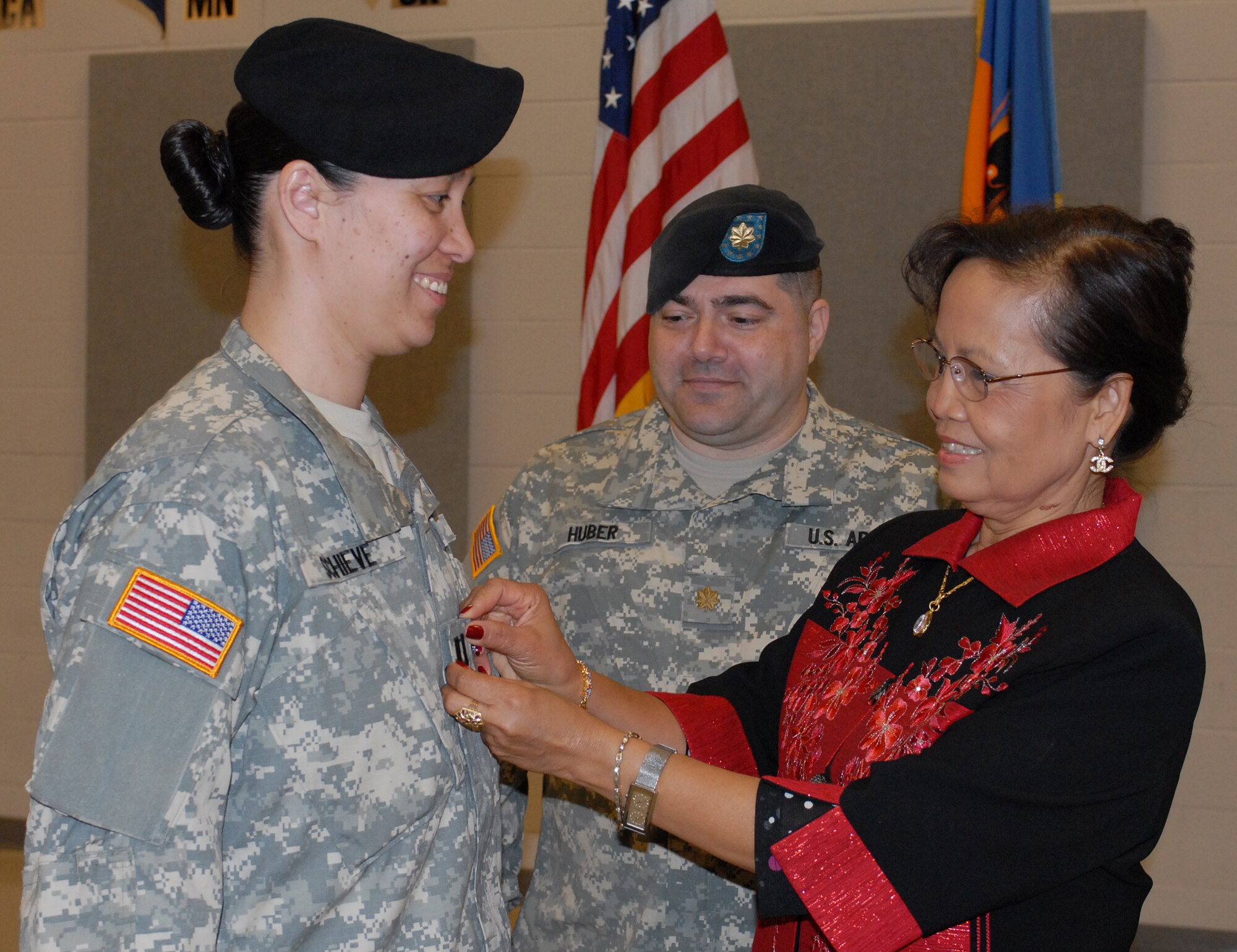 1st Lt. Karin Schieve, 244th Aviation Brigade, is promoted to the rank of captain by her husband, Maj. Joseph Huber, 72nd Field Artillery Brigade, and mother Carri Schumann, here April 19. (U.S. Army photo)