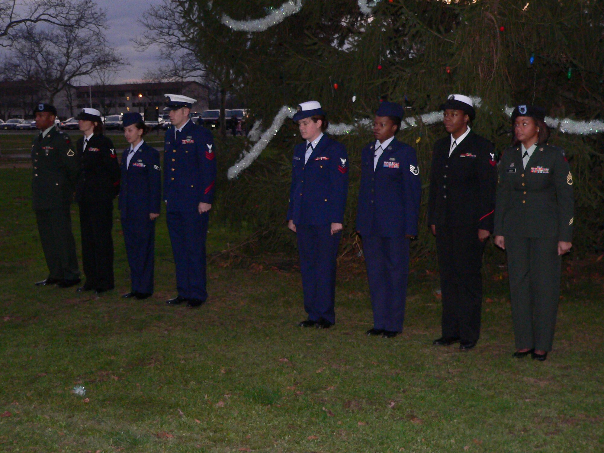Airmen from the 87th Civil Engineering Squadron lower their heads during the "Prayer for the Nation" invocation, administered by Chaplain (Lt. Col.) Joseph Lim, at the McGuire tree lighting ceremony, Dec. 1. "We thank you for this time of fun and fellowship that we take part in tonight and for the true meaning of the Holiday Season," said Chaplain Lim. (U.S. Air Force Photo/ Pascual Flores)