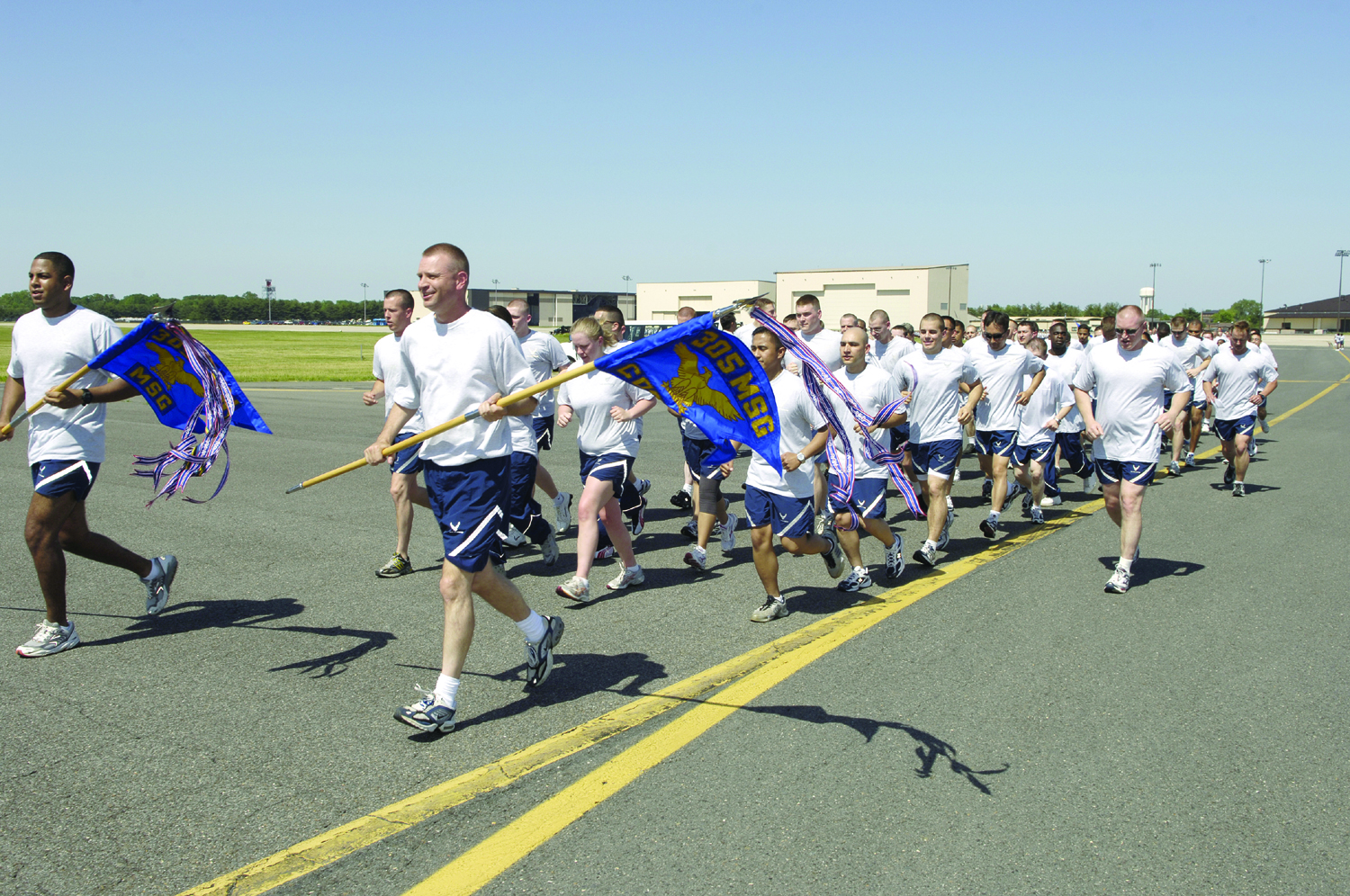 The 305th Communications Squadron runs in formation on the flight line during the Joint Base Warrior Run May 30. The run featured members of Fort Dix, Lakehurst and McGuire running 2.6 miles on runway 360. (U.S. Air Force photo by Kenn Mann)