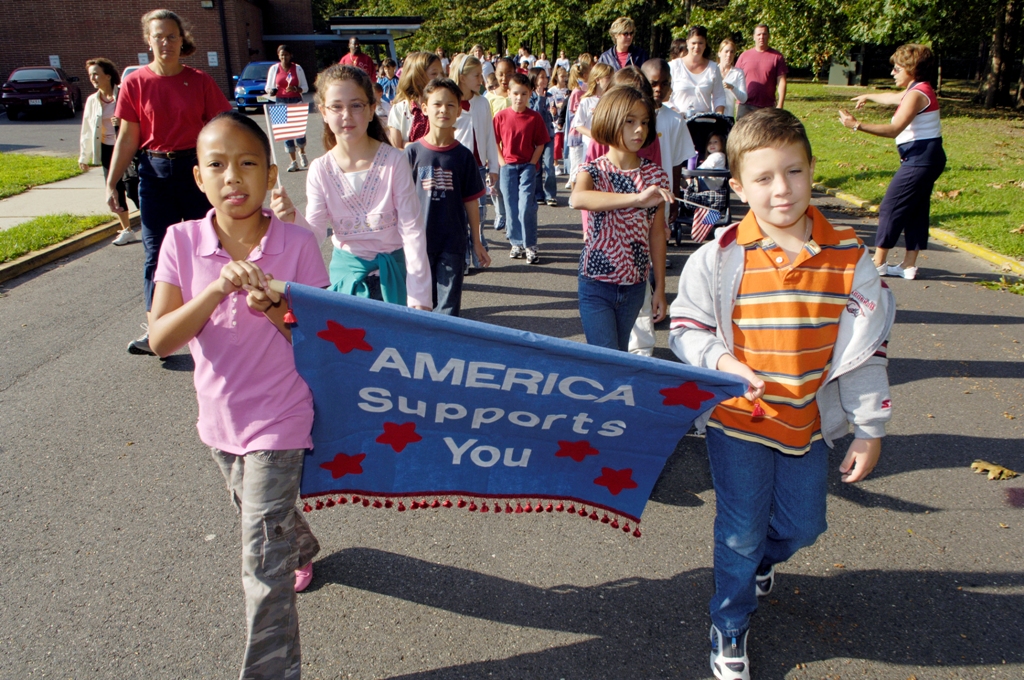 Students with the Columbia School, North Hanover, New Jersey carry a “America Supports You” banner during the Freedom Walk taking place in remembrance of September 11, 2001. Third and fourth grade students from the Columbia and Discovery schools, North Hanover, New Jersey along with Airmen from McGuire Air Force Base and the local community participated in the walk on September 11, 2006. USAF photo by Denise Gould.