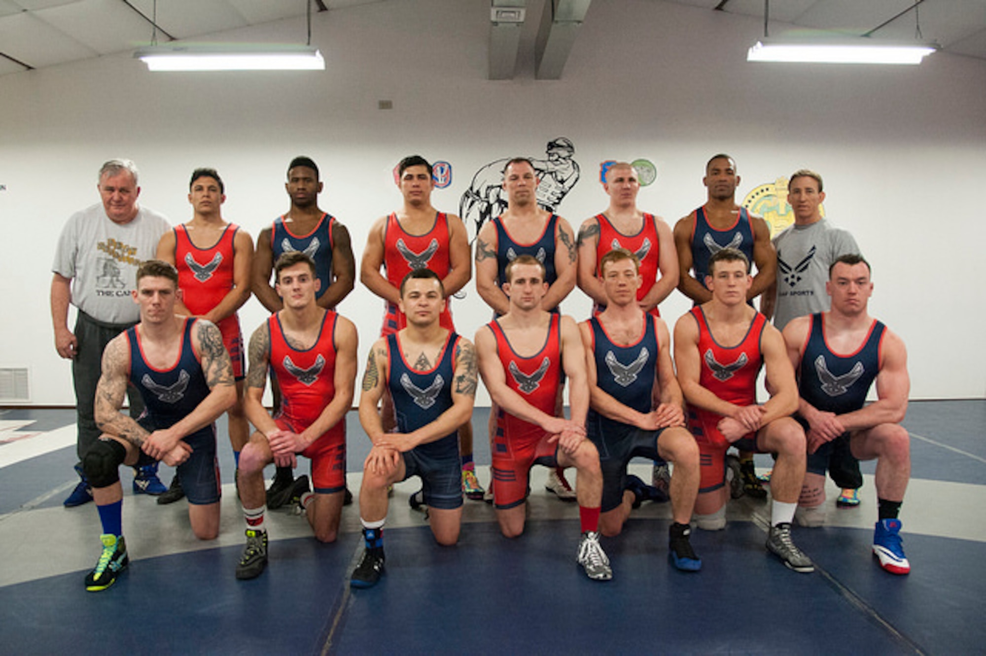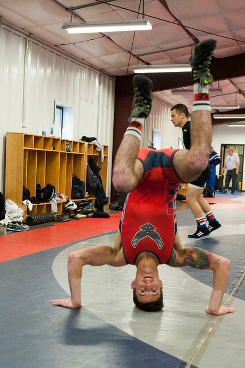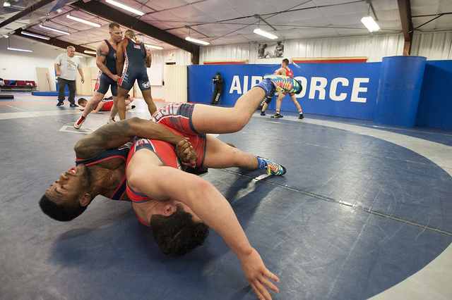 Senior Airman Brandon Johnson, Fairchild AFB, Wa., flips Senior Airman Jorge Hernandez, Hurlburt Field, Fla., while training for the Armed Forces Wrestling Championships. The team will compete in the Freestyle and Greco-Roman style in the tournament. (U.S. Air Force photo by Christian DeLuca/released)
