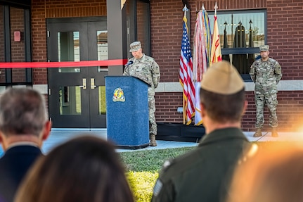 U.S. Army Col. Mitchell Wisniewski, Joint Base McGuire-Dix-Lakehurst deputy commander, and Army Support Activity Fort Dix commander, gives an address at the Army Support Activity Fort Dix Aviation Facility ribbon cutting ceremony at Joint Base McGuire-Dix-Lakehurst N.J. on Aug. 19, 2022. The Army Aviation Facility Project was a MILCON effort valued at 11.7 million dollars and made possible through the joint effort of ASA Fort Dix and the U.S. Marine Corps Marine Aircraft Group 49. The 2100 square foot building is host to an Army Ramp Management Area which provides a wide range of capabilities for both fixed and rotary wing aircraft such as the C-130, CH-47S, and UH-60S. The addition of the new Army Ramp will provide enhanced load out and aviation operation training capabilities, parking for Army aviation aircraft, refueling, troop movement and flight planning operations for approximately 216,000 people that use JB MDL to meet readiness requirements.